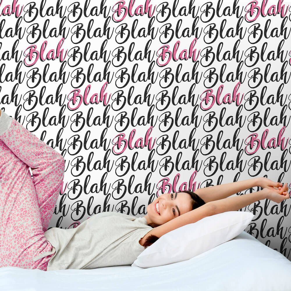 O Papel de Parede Blah Blah é fabricado em adesivo vinil fosco 3M, autocolante e com excelente qualidade de impressão. Não precisando de cola.